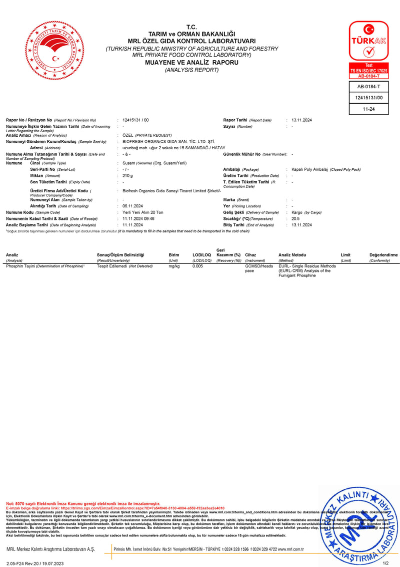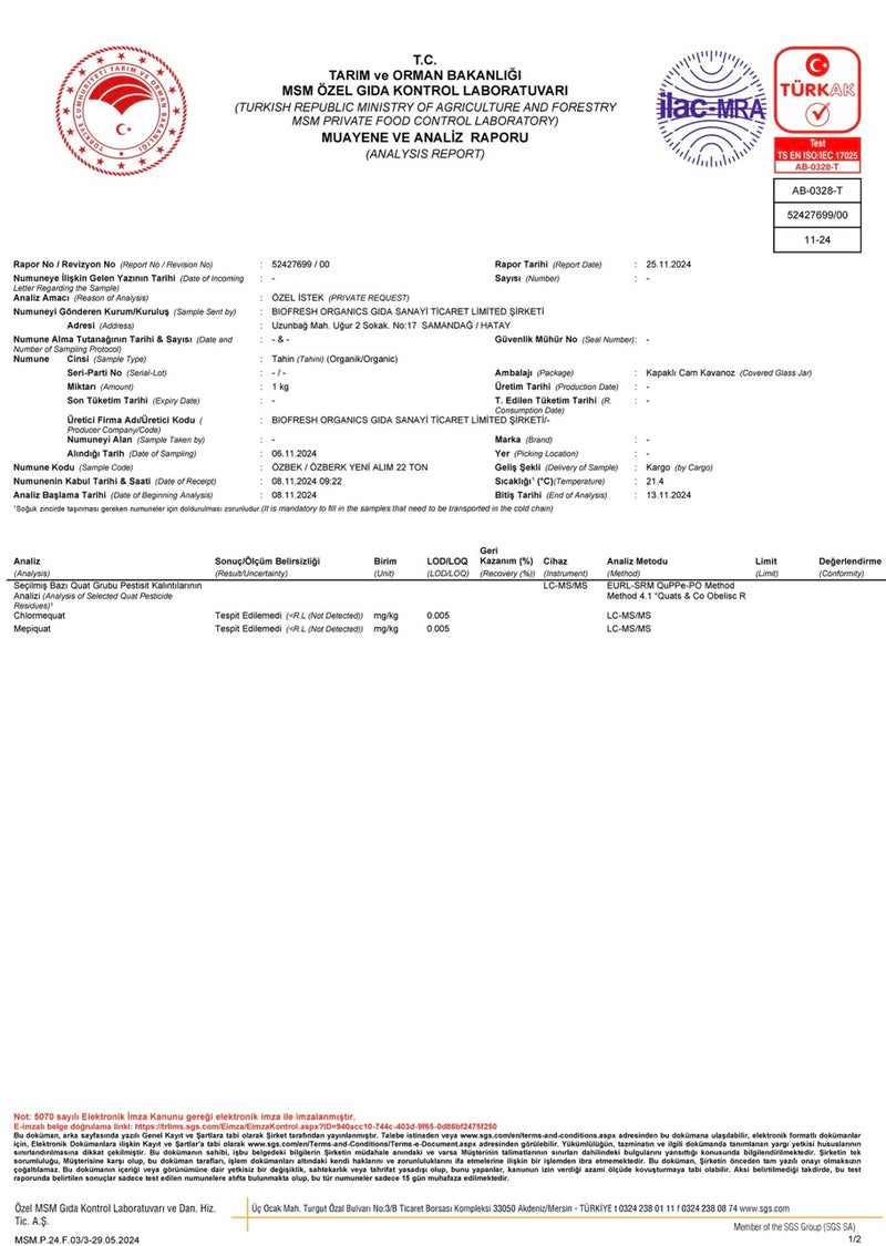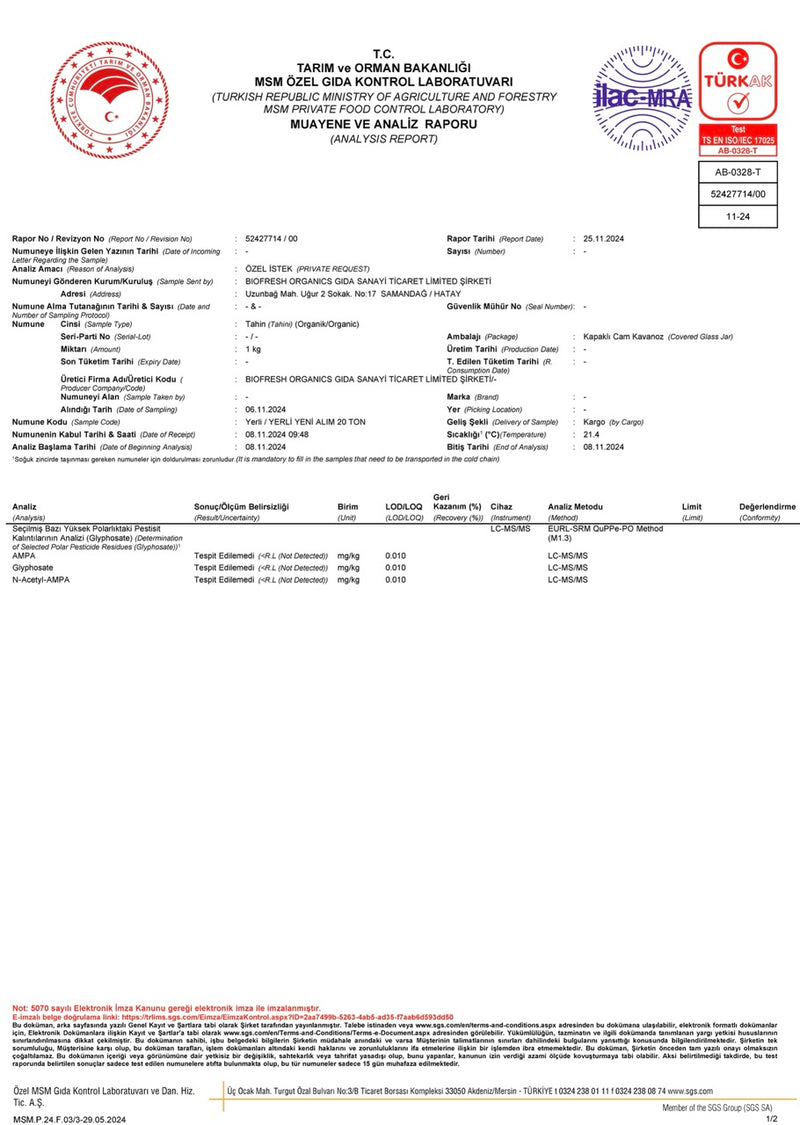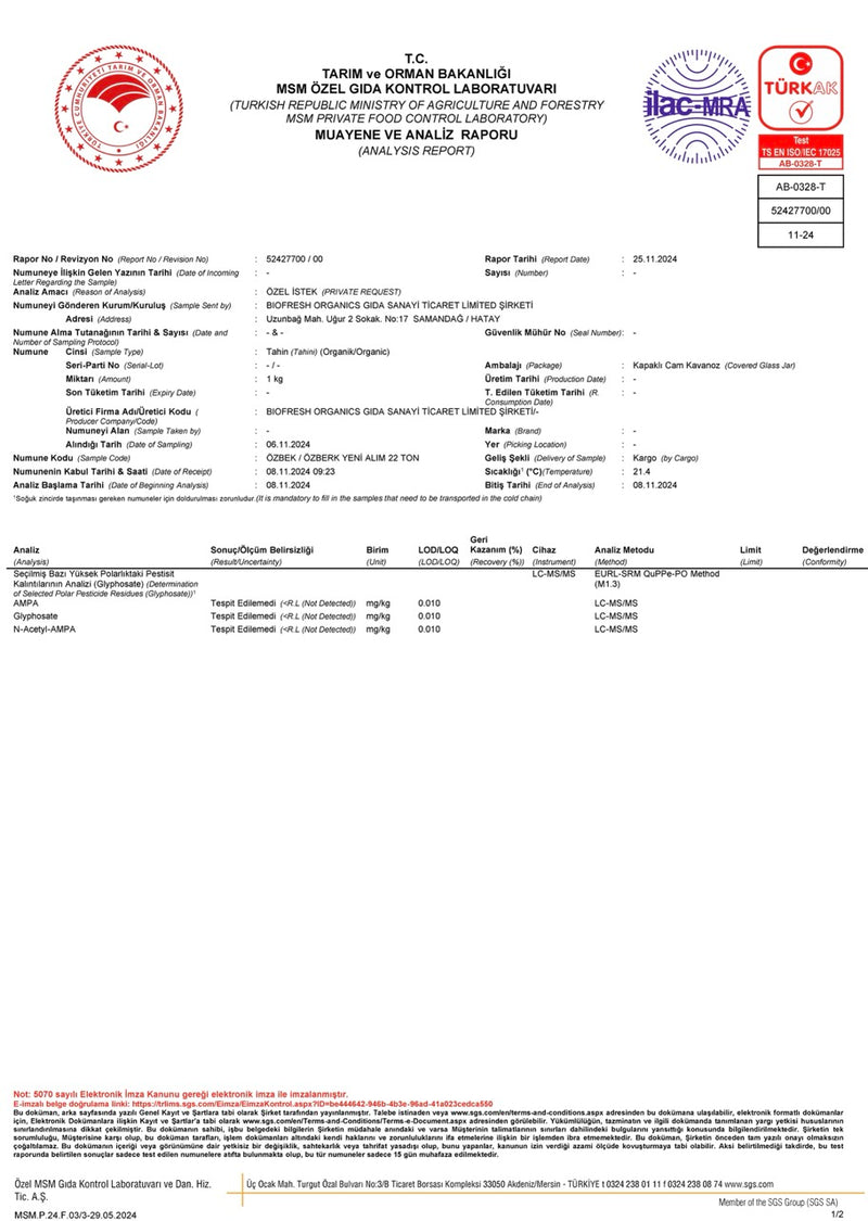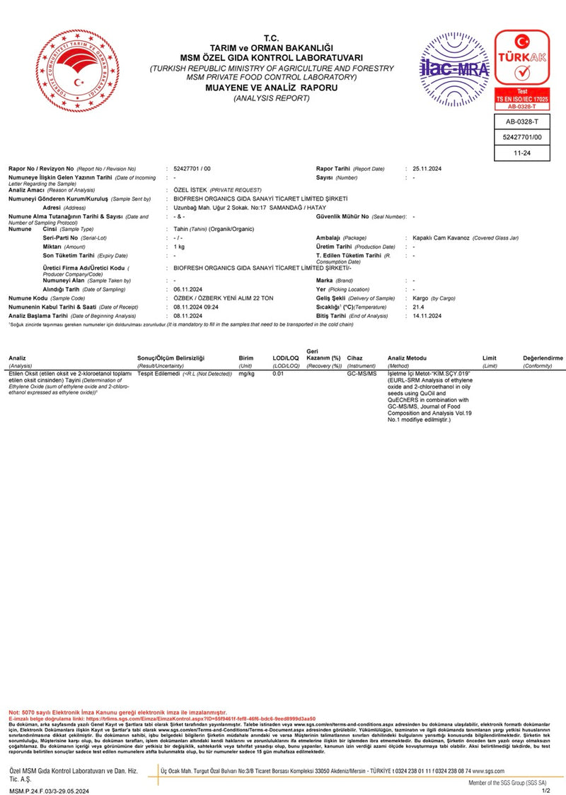 Organik Özberk Tahini Pestisit Kalıntı Analiz Raporu