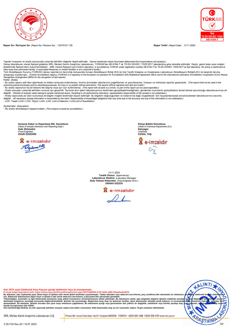 Ürünümüz, 750’den fazla pestisit kalemi için yapılan kapsamlı analizlerde “Tespit Edilemedi” sonucu almıştır. Doğallığı ve temiz içeriği, akredite laboratuvar tarafından onaylanmıştır. Gönül rahatlığıyla tüketebilirsiniz.