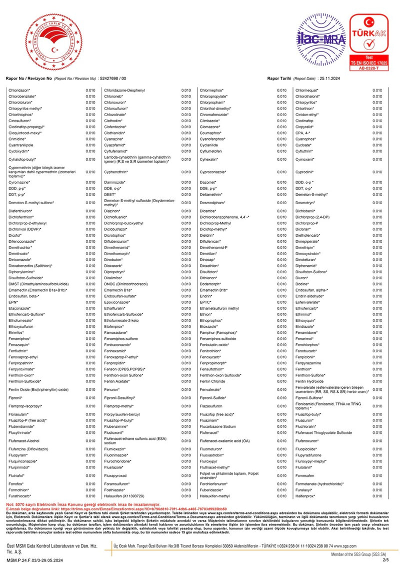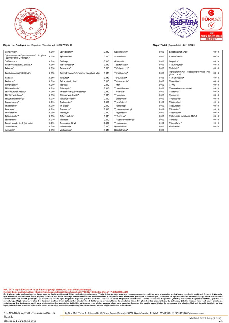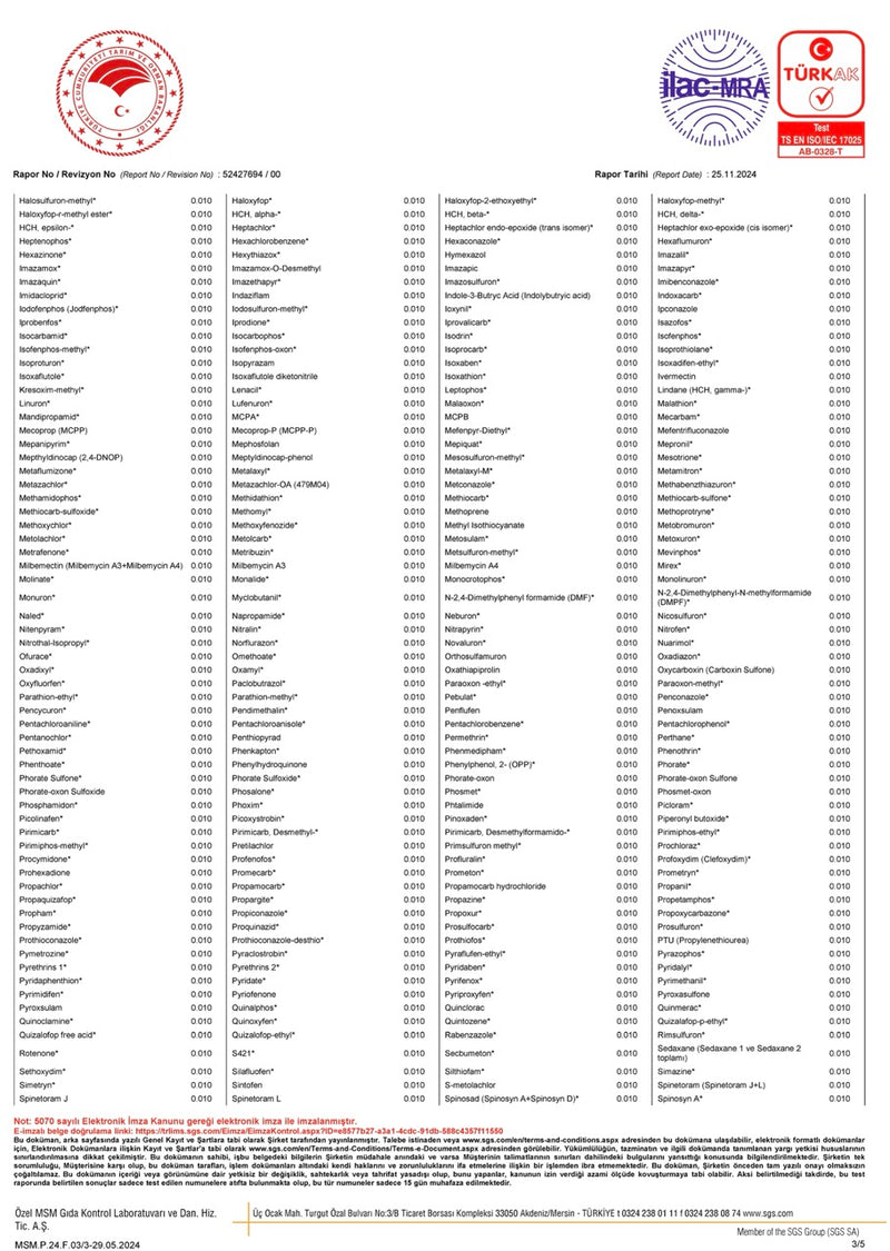 Ürünümüz, pestisit kalıntı testlerinden başarıyla geçmiştir. Seçilmiş bazlı tarım ilaçlarına karşı yapılan analizlerde kalıntı tespit edilmemiştir. Temiz içerik, bilimsel analizle belgelenmiştir.