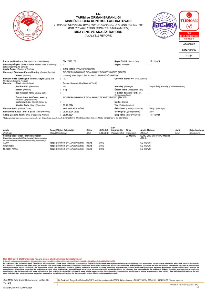 Atalık Özberk Susamı Glifosat ve AMPA Kalıntı Analiz Raporu